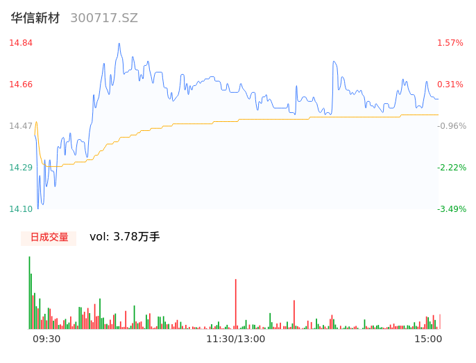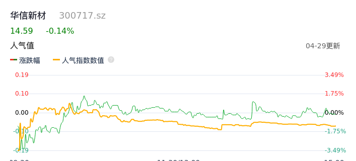 04月29日,华信新材收报14.59,股价涨幅-0.14%,成交金额5493.68万元,换手率3.71%。