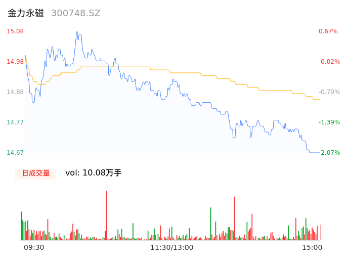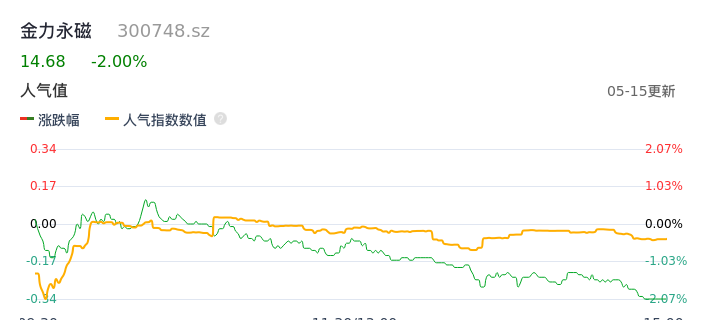 05月15日,金力永磁收报14.68,股价涨幅-2.00%,成交金额1.50亿元,换手率0.89%。