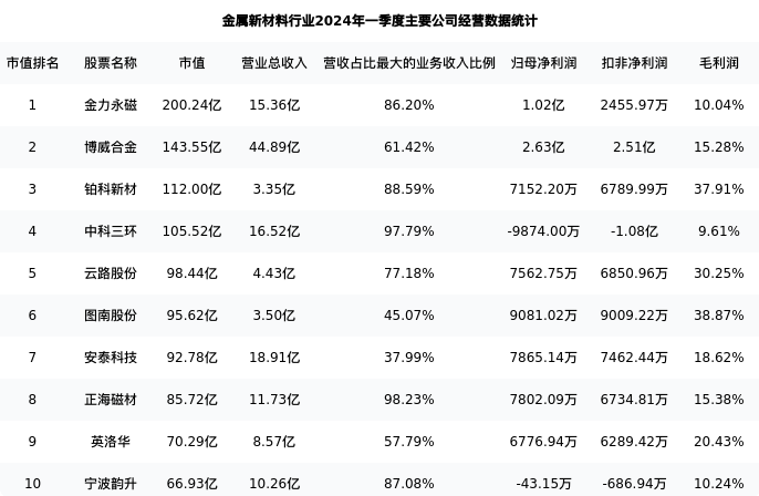 金力永磁最新报告期数据为一季度,下表汇总了金属新材料行业内市值靠前的公司一季度主要经营数据
