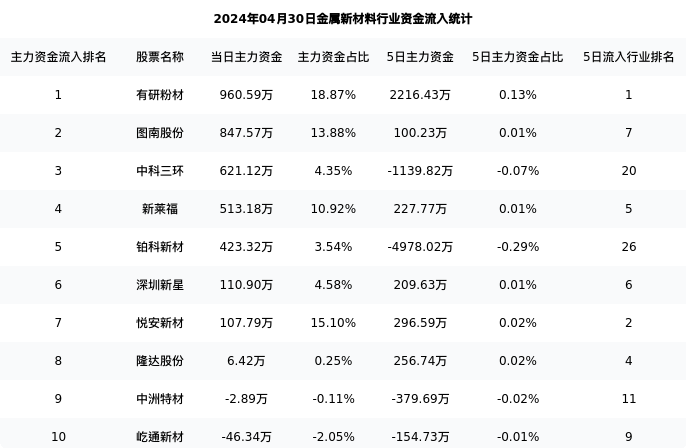 从主力资金流向来看,金属新材料行业今日主力资金流入6.71亿元,在所有申万二级行业中排名:70/131。