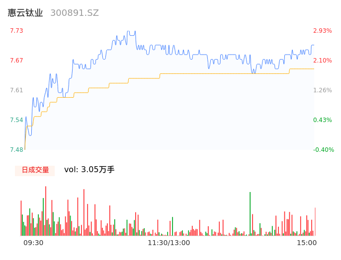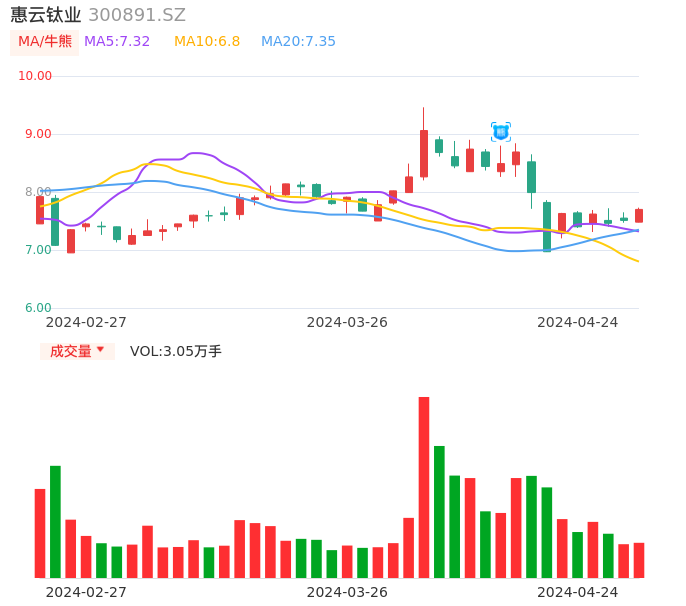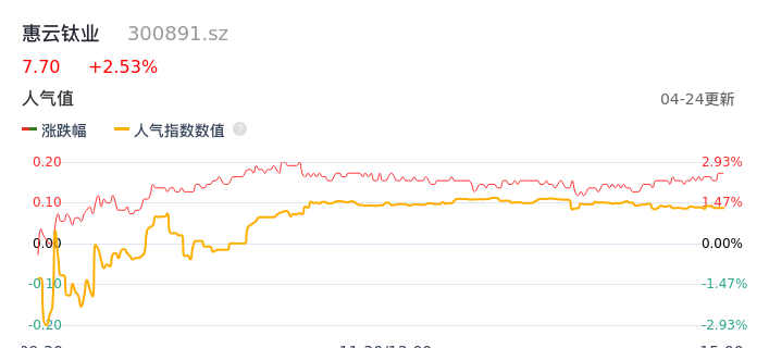 04月24日,惠云钛业收报7.70,股价涨幅2.53%,成交金额2329.77万元,换手率0.92%。
