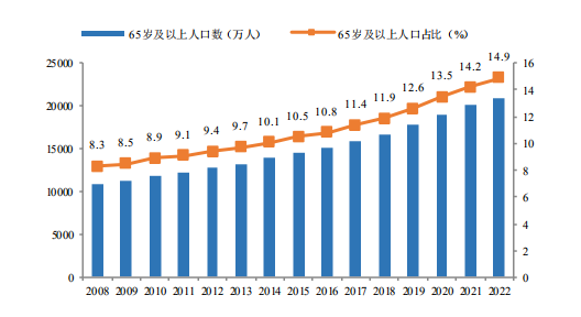 我国老年人口数量多,人口老龄化发展速度快。截至2022年底,全国60岁及以上老年人口达2.67亿,占总人口的18.9%;65岁及以上老年人口达2亿以上,占总人口的14.2%。据卫健委数据,预计“十四五”时期,60岁及以上老年人口总量将突破3亿,占比将超过20%,进入中度老龄化阶段;2035年左右,60岁及以上老年人口将突破4亿,在总人口中的占比将超过30%,进入重度老龄化阶段;到2050年前后,我国老年人口规模和比重、老年抚养比和社会抚养比将相继达到峰值。