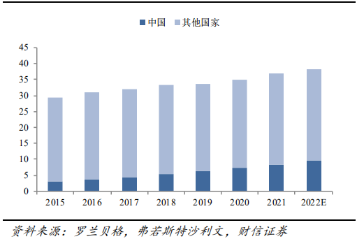 2015-2022E中国及其他国家医疗器械市场规模(千亿元)
