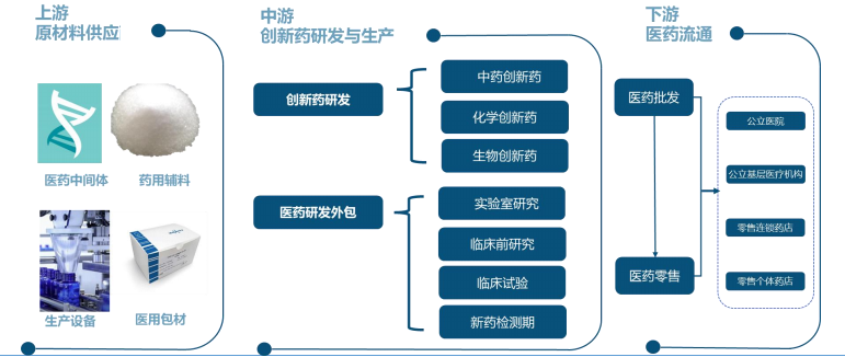 从创新药产业链来看,创新药位于产业链中游。上游原材料供应主要包括:医药中间体、药用辅料、生产设备和医用包材等。中游的创新药研发与生产企业对上游原材料进行加工,包括产业链一体化的创新药研发企业,继续细分可分为中药创新药、化学创新药和生物创新药;以及为创新药研发提供支撑的医药研发外包企业。产业链下游为医药流通,医药流通环节可分为医药批发市场、医药零售市场两个部分,医药零售包括公立医院、公立基层医疗机构和零售药店,其中零售药店又可分为连锁药店和个体药店。