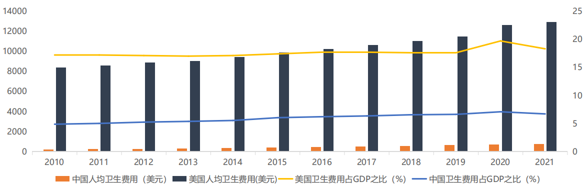 中国/美国人均卫生费用(左,美元)以及对比卫生费用占GDP之比(右,%)对比