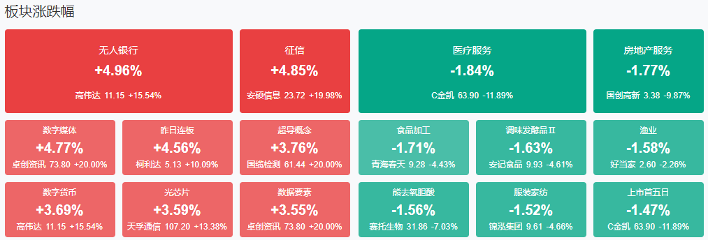 盘面上,券商股冲高回落,首创证券涨停,太平洋、哈投股份等多只个股尾盘炸板;互利网金融股表现活跃,卓创资讯、安硕信息20CM涨停。超导概念股午后异动拉升大涨,国缆检测20CM涨停,全天振幅超30%,百利电气涨停。AI概念股迎来反弹,数据要素概念股早盘走强,生意宝、中原传媒涨停,中国联通盘中一度涨停;算力概念股午后活跃,浪潮信息、工业富联、中际旭创涨超5%。下跌方面,CRO概念股陷入调整,睿智医药跌超5%。板块方面,超导概念、算力租赁、数据要素、信创等板块涨幅居前,食品加工、CRO、服装家纺、养殖等板块跌幅居前。