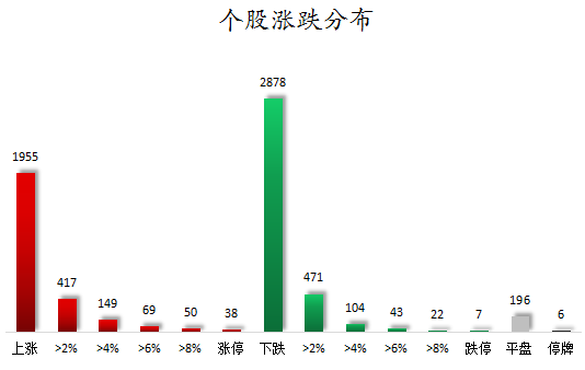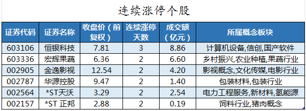截至收盘,沪深两市合计1955只个股上涨,2878只个股下跌,平盘个股196只,停牌的个股6只。不含当日上市新股,共有38只个股涨停,7只个股跌停。连续涨停天数看,恒银科技已连收3个涨停板,连续涨停板数量最多。