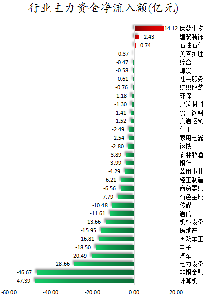 从行业板块来看,申万所属的31个一级行业,今日仅有医药生物、建筑装饰、石油石化3个行业板块主力资金呈现净流入,净流入金额分别为14.12亿元、2.43亿元、0.74亿元。28个行业板块主力资金呈现净流出,其中,计算机行业板块主力资金净流出最多,净流出金额为47.39亿元;行业板块主力资金净流出靠前的还有非银金融、电力设备、汽车、电子、国防军工、房地产,净流出金额分别为46.67亿元、28.66亿元、20.49亿元、18.5亿元、16.81亿元、15.95亿元。