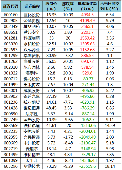 盘后龙虎榜数据显示,今日机构席位资金合计净卖出约4.04亿元。其中,净买入的个股11只,净卖出的个股16只。机构净买入最多的股票是巨化股份,净买入金额约4934.5万元;机构净买入的居前还有金逸影视、精华制药、盛邦安全等股。机构净卖出最多的股票是华勤技术,净卖出金额约2.35亿元;机构净卖出居前的还有太平洋、维科精密、麦趣尔等股。