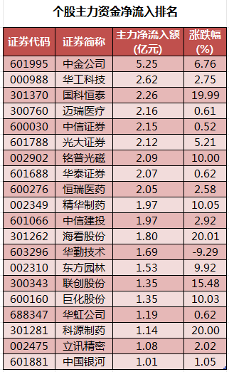 个股来看,今日有1803只个股获主力资金净流入,其中,20股获主力资金净流入超1亿元。中金公司获主力资金净流入最多,净流入金额为5.25亿元;主力资金净流入居前的个股还有华工科技、国科恒泰、迈瑞医疗、中信证券、光大证券,流入金额分别为2.62亿元、2.26亿元、2.16亿元、2.15亿元、2.12亿元。