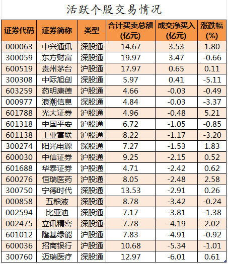活跃个股方面,北向资金今日净买入的有中兴通讯、东方财富、贵州茅台、中际旭创,净买入金额分别为3.53亿元、3.47亿元、0.65亿元、0.41亿元。北向资金净卖出较多的有迈瑞医疗、招商银行、隆基绿能、立讯精密、比亚迪,净卖出金额分别为6.01亿元、5.34亿元、4.91亿元、4.19亿元、3.81亿元。
