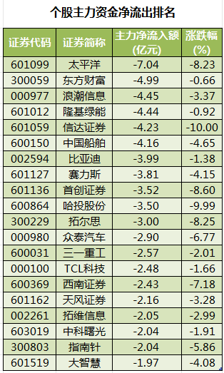 此外,3208只个股被主力资金净卖出,其中,64股被主力资金净卖出超1亿元。主力资金净流出最多的个股是太平洋,净流出金额为7.04亿元;主力资金净流出居前的个股还有东方财富、浪潮信息、隆基绿能、信达证券、中国船舶,净流出金额分别为4.99亿元、4.45亿元、4.44亿元、4.23亿元、4.16亿元。