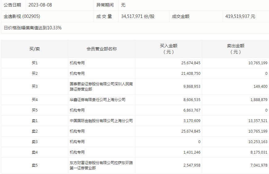 金逸影视今天涨停。盘后数据显示,6个机构出现在龙虎榜单上,合计净买入4109.49万元;国泰君安证券股份有限公司深圳人民南路证券营业部买入986.9万元,同时卖出14.94万元;中国国际金融股份有限公司上海分公司买入317.06万元,同时卖出1335.75万元。