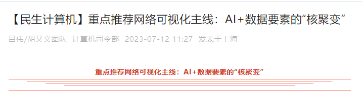 1)核心逻辑:运营商数据要素的“掘金铲”。事件:7月12日【民生计算机】报告,重点推荐网络可视化主线:AI+数据要素的“核聚变”。
