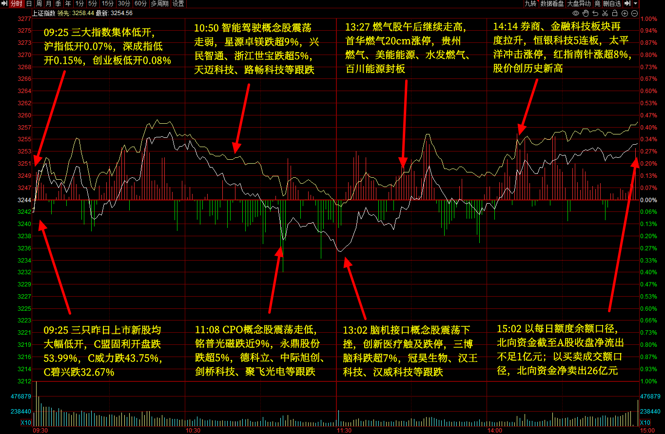 指数方面,三大指数集体低开,早盘受益欧洲天然气价格飙升,天然气等相关能源产业链集体大涨,推动股指震荡反弹。但汽车产业链以及大消费、CPO等低迷依旧拖累股指二次探底。但午后券商和金融科技双双爆发,三大股指快速翻红。
