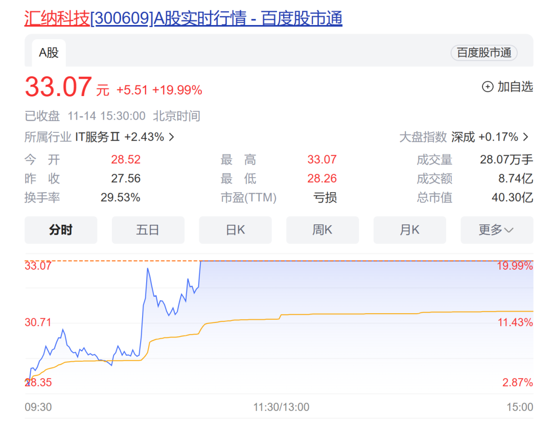 11月15日,汇纳科技(300609)收到深交所关注函。汇纳科技昨日通过公告宣布“A100算力服务收费拟上调100%”的消息,引发市场对算力租赁概念的关注。不过在公告前,汇纳科技即已“提前”完成“20CM涨停”,公司微信公众号或成为信息首发平台。