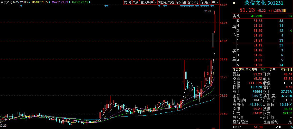 5月12日,荣信文化再度大幅上涨,截至发稿,报51.23元,涨超11%,成交额3.85亿元。此前,荣信文化股价连续两个交易日涨停。