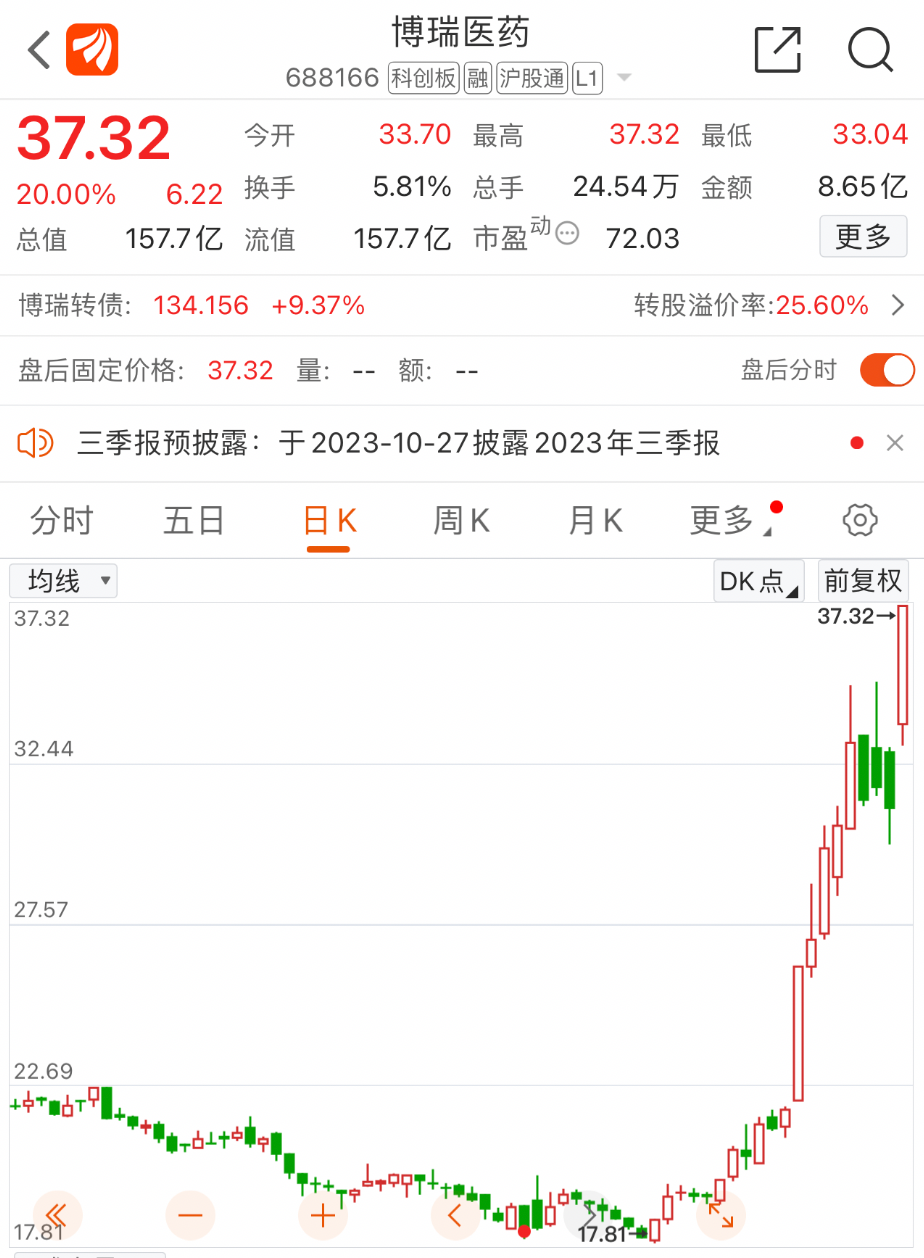截至10月13日收盘,博瑞医药股价报37.32元,总市值升至157.66亿元。
