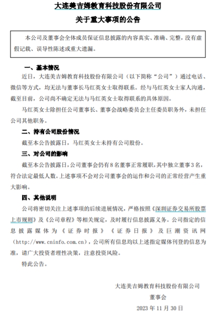 11月29日晚,美吉姆公告,近日,公司通过电话、微信等方式,均无法与董事长马红英取得联系。经与马红英家人沟通,截至目前,公司尚不确定无法与马红英取得联系的具体原因。马红英除担任公司董事长、董事会战略委员会主任委员职务外,未担任公司其他职务。