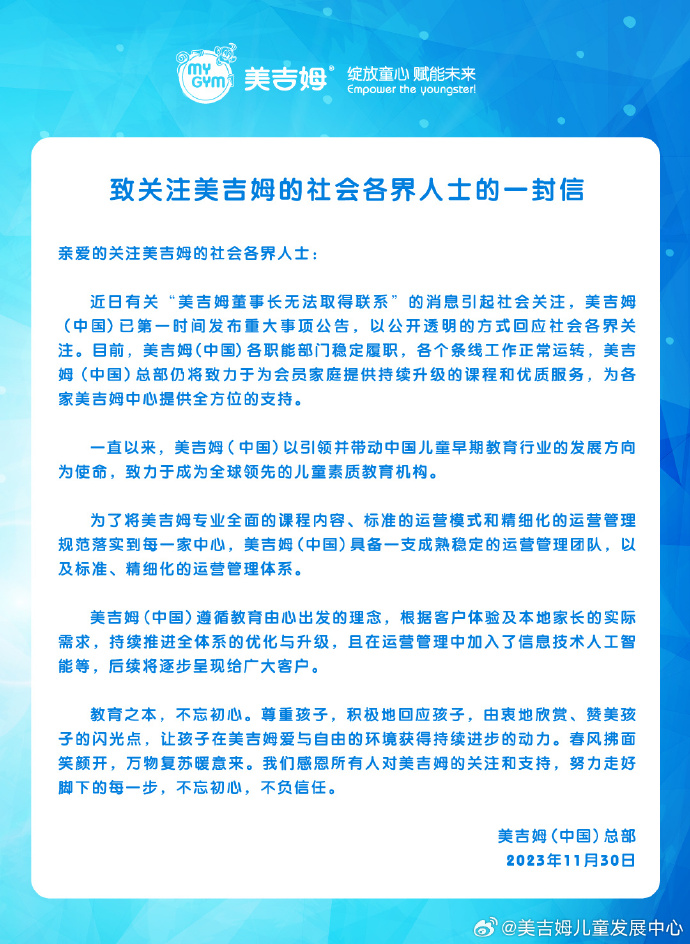 11月30日,美吉姆官微发文表示,近日有关“美吉姆董事长无法取得联系”的消息引起社会关注。目前,美吉姆(中国)各职能部门稳定履职,各个条线工作正常运转。