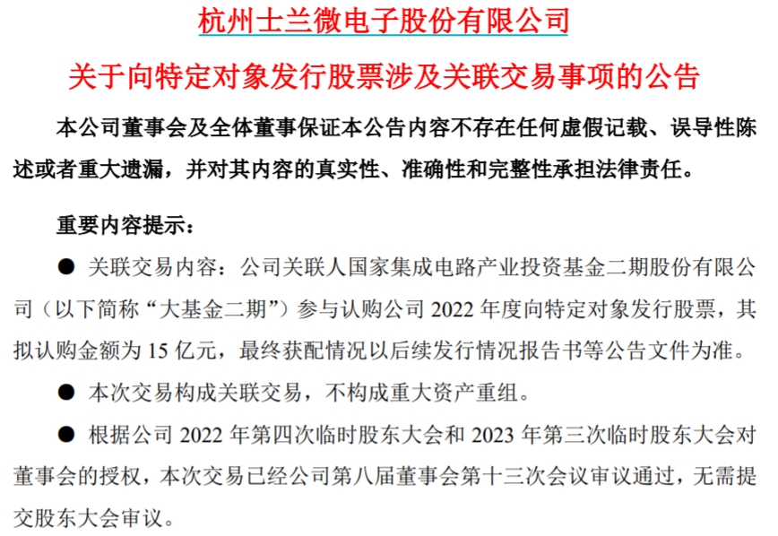 11月8日,士兰微公告,国家集成电路产业投资基金二期股份有限公司向公司发送了向特定对象发行股票申购报价单等文件,其拟出资15亿元认购公司本次向特定对象发行股票,最终获配情况以后续发行情况报告书等公告文件为准。