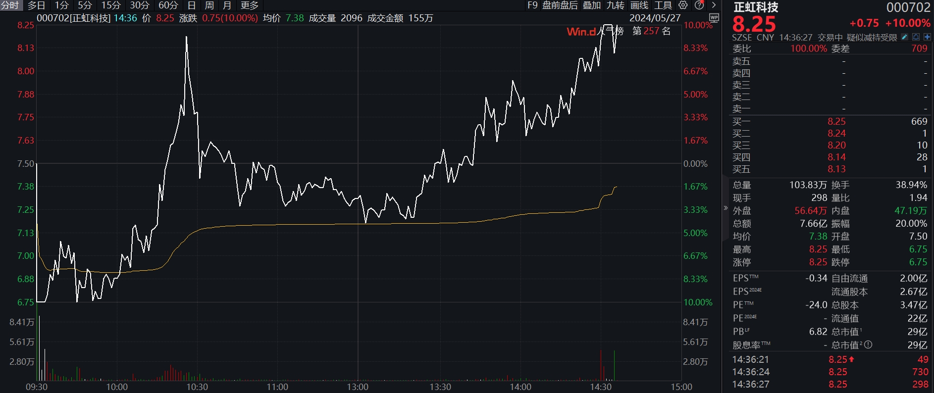 5月27日,正虹科技尾盘拉升触及涨停,上演“地天板”。该股早盘一度触及跌停。