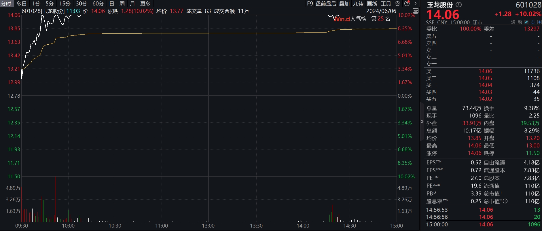 6月6日,玉龙股份涨停,收获3天2板,截至收盘,报14.06元,涨停板上封单超万手,全天成交额逾10亿元。