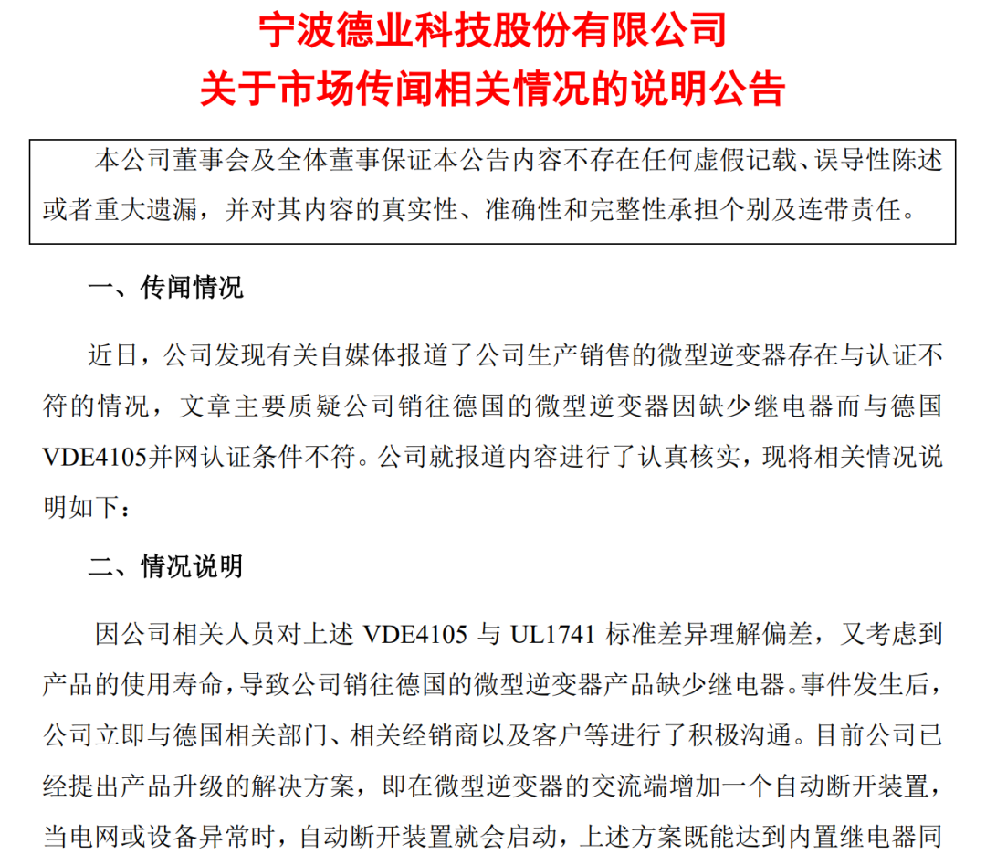 在最新披露的说明公告中,德业股份确认了这则传闻的真实性。德业股份表示,公司就报道内容进行了认真核实,因公司相关人员对上述VDE4105与UL1741标准差异理解偏差,又考虑到产品的使用寿命,导致公司销往德国的微型逆变器产品缺少继电器。