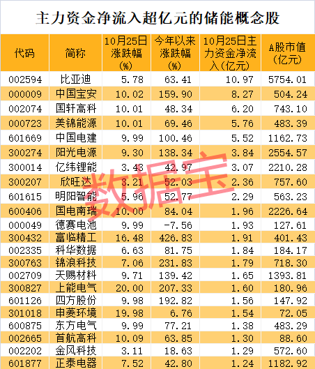 盘后资金流向来看,数据宝统计,储能板块今日主力资金净流入合计69.79亿元。比亚迪、中国宝安、国轩高科、美锦能源、中国电建等主力净流入额均超5亿元,这5股除比亚迪外均录得涨停板。
