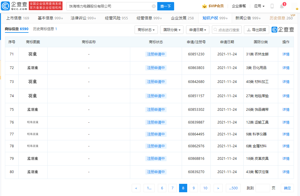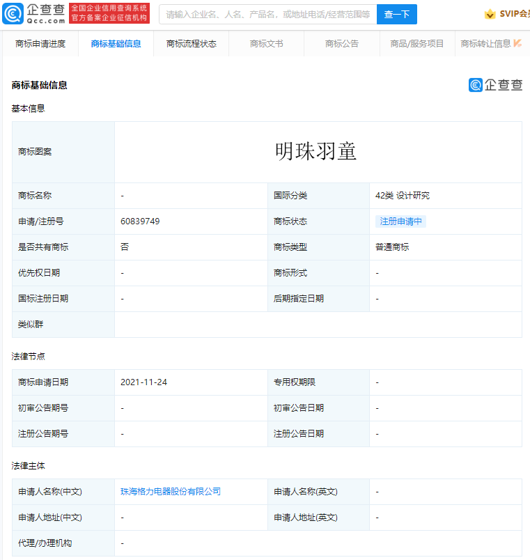据企查查显示,近日,珠海格力电器股份有限公司申请注册多个“明珠羽童”“孟羽童”“羽童”商标,国际分类含广告销售、科学仪器、方便食品、设计研究、医疗园艺、日化用品等,申请日期为2021年11月24日,当前商标状态均为申请中。