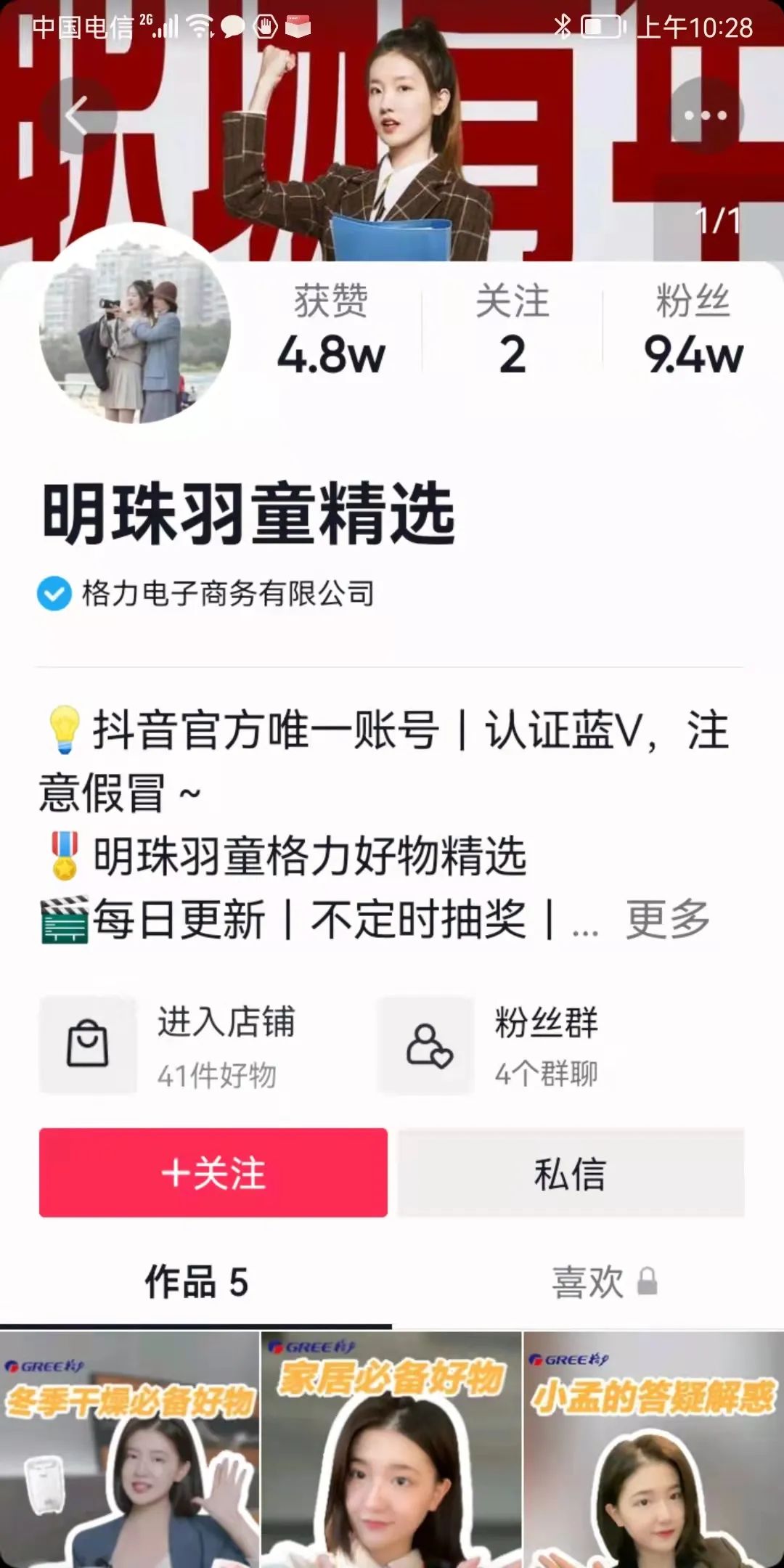 目前,该账号共发布了5个视频。在第一个视频中,孟羽童表示“将在此账号分享格力电器的产品”,其余4个均为孟羽童的带货视频。值得注意的是,目前该账户已有粉丝9.4万(上周六为3.5万),获赞4.8万人次(上周六为2.1万人次)。
