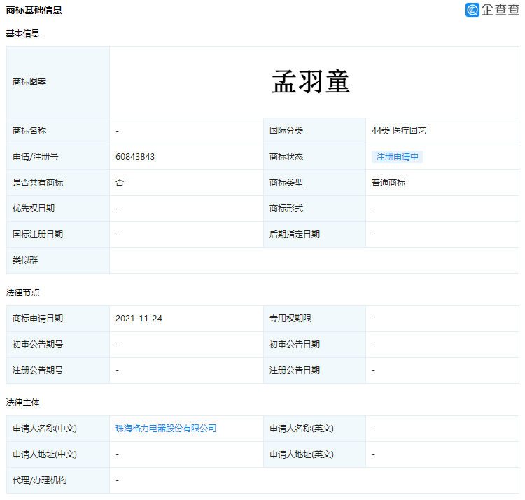 格力申请孟羽童商标