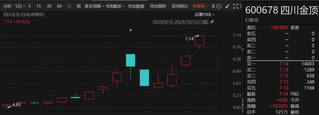 10月15日,四川金顶(600678)股票再度封于涨停板,报收7.14元/股,刷新近半年高点。这已是该公司连续第二个交易日录得涨停,近三个交易日累计涨幅达25%。