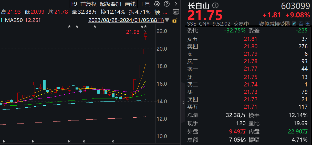 1月5日,长白山大涨,截至发稿,股价报21.75元,涨超9%。该股此前录得三连板。