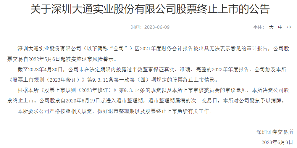 *ST大通因2021年度财务会计报告被出具无法表示意见的审计报告,公司股票交易自2022年5月6日起被实施退市风险警示。截至2023年4月30日,公司未在法定期限内披露过半数董事保证真实、准确、完整的2022年年度报告。触及股票终止上市情形,深交所决定公司股票终止上市。
