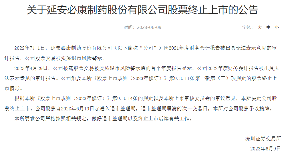 6月9日晚间,深交所发布公告,决定延安必康制药股份有限公司(*ST必康)、深圳大通实业股份有限公司(*ST大通)、中潜股份有限公司(*ST中潜)等3家公司股票终止上市,自6月19日起进入退市整理期。