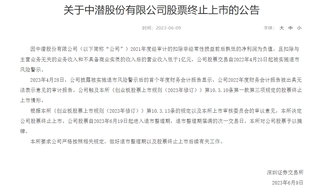 此外,*ST中潜2021年度经审计的扣除非经常性损益前后孰低的净利润为负值,且扣除与主营业务无关的业务收入和不具备商业实质的收入后的营业收入低于1亿元,公司股票交易自2022年4月25日起被实施退市风险警示。2023年4月28日,公司披露被实施退市风险警示后的首个年度财务会计报告显示,公司2022年度财务会计报告被出具无法表示意见的审计报告。公司触及股票终止上市情形,深交所决定公司股票终止上市。