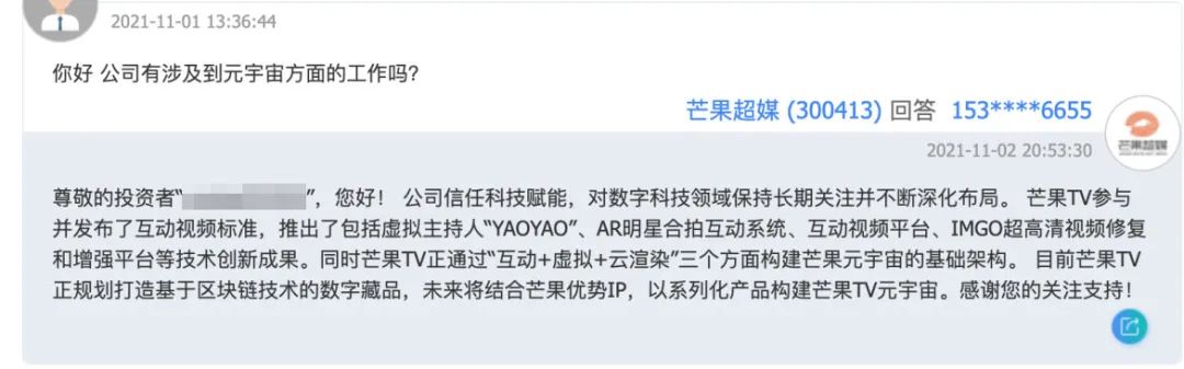 11月2日晚间,芒果超媒在互动易平台上回答投资者提问时表示:公司信任科技赋能,对数字科技领域保持长期关注并不断深化布局。芒果TV参与并发布了互动视频标准,推出了包括虚拟主持人“YAOYAO”、AR明星合拍互动系统、互动视频平台、IMGO超高清视频修复和增强平台等技术创新成果。同时,芒果TV正通过“互动+虚拟+云渲染”三个方面构建芒果元宇宙的基础架构。目前芒果TV正规划打造基于区块链技术的数字藏品,未来将结合芒果优势IP,以系列化产品构建芒果TV元宇宙。