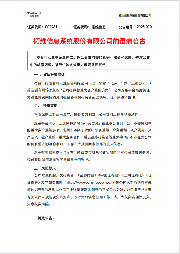 拓维信息发布澄清公告称,关注到有网传消息称“公司拟调整重大资产重组方案”,公司及董事会高度关注,为避免相关网传消息对社会各界和投资者造成误导,现予以澄清说明。