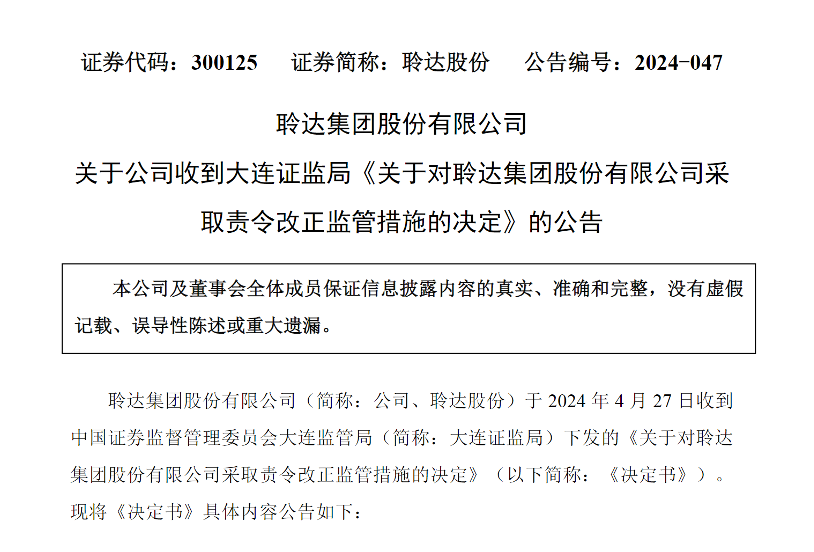 致同的审计还暴露了聆达股份2023年关联方非经营性资金占用问题。4月27日中午,聆达股份公告收到大连证监局下发的《关于对聆达集团股份有限公司采取责令改正监管措施的决定》。