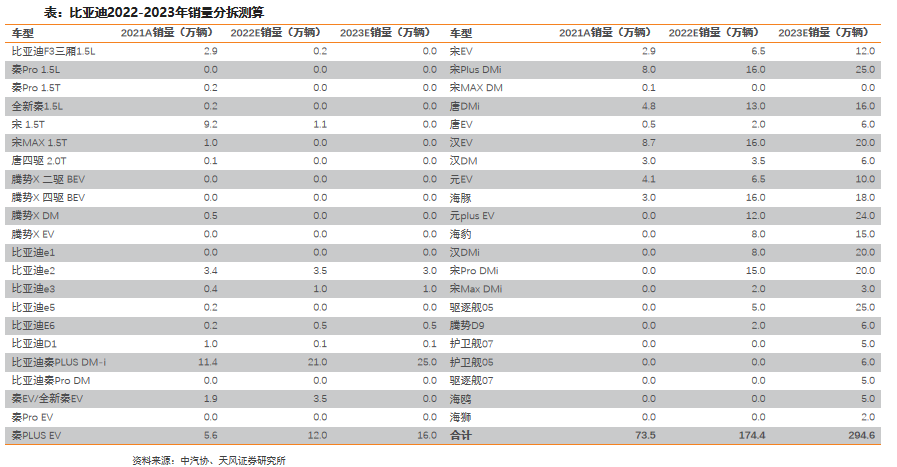 在市场定位方面,公司深耕20万元以下大众市场,通过热销车型汉、海豹等实现对20万以上的中高端市场的拓展,并通过腾势和高端新品牌持续实现品牌向上,进一步打开价格天花板。我们认为,比亚迪的新能源产品处于车型丰富、车价上探、销量攀升的阶段。三重合力下,比亚迪正处于量价利齐升的上升通道。据我们测算,比亚迪2022年销量有望达到174万台,同比增加137%;2023年销量则有望达到295万台。