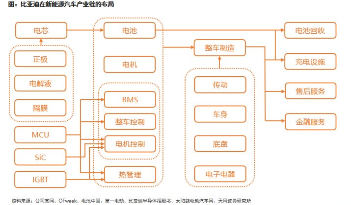 比亚迪深度布局、垂直整合新能源汽车产业链,从上游原材料到中游零部件再到下游整车,形成完整闭环,产业链协同效应显著。