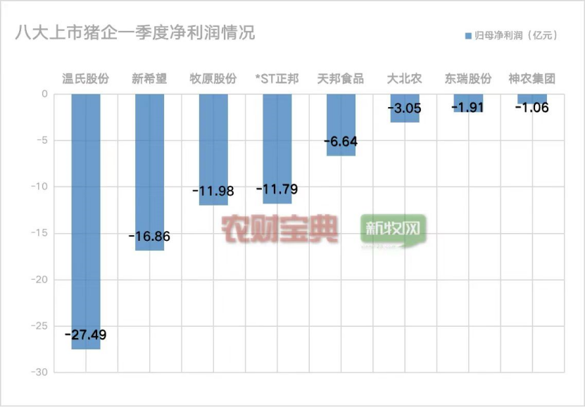 国金证券研究员刘宸倩分析称,总体来看,短期生猪供给端压力依旧偏大,随着二季度供给端环比回升,预计二季度生猪价格低位震荡,不排除再次下探的可能性,养殖端处于亏损的时间可能拉长,从而导致行业持续去产能。其认为,在行业平均生产效率提升的背景下,2023年猪肉供给量或超过2022年,2023年整体均价表现或低于2022年,去产能大概率成为今年生猪养殖行业的主旋律。卖得越多,亏得越多。众多猪企正在煎熬之中。近几年凶猛扩张的猪企,随着猪行情的持续下行,这份煎熬成了其不可承受之重。2023年一季度,猪企大面积亏损,行业前五大巨头——牧原股份、温氏股份、新希望、天邦食品、正邦科技,累计净亏损额近75亿元。
