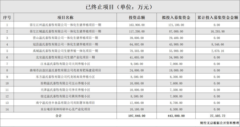 而温氏股份则不存在资不抵债的问题,368.48亿的流动资产足以覆盖267.94亿的流动负债,流动比率为1.38,相对健康。分析人士表示,在企业动作上,温氏股份同样在“收拳”。今年4月,温氏股份公告计划终止崇左温氏畜牧有限公司肉鸭一体化养殖项目。至于终止该项目的原因,温氏股份表示公司其他区域的子公司存在部分市场重叠、价格竞争、增加内耗的情况,预计继续建设并投产该项目的经营效益将存在较大不确定性。从2022年4月至今,温氏股份已经终止了多个募投项目。