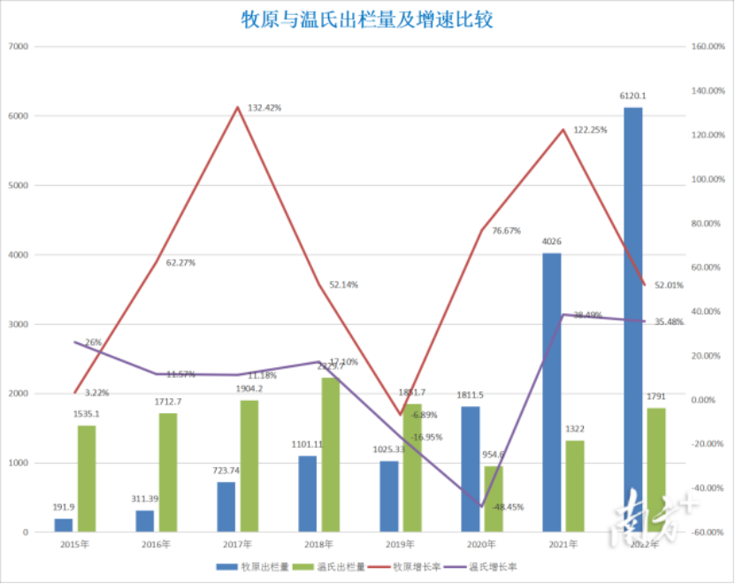 此外,牧原则成功运用了二元轮回繁育体系,把商品代母猪培育为能繁母猪,在母猪严重缺乏时期实现了快速补充。2021年,牧原飙升至4016万头,温氏为1322万头;2022年,牧原继续猛增至6120万头,温氏为2160万头。根据年报披露,2022年牧原股份“豪赚”132.66亿元,温氏股份同期净利润52.89亿元。截至周五收盘(7月14日),牧原股份总市值2273亿元,温氏股份总市值1211亿元。
