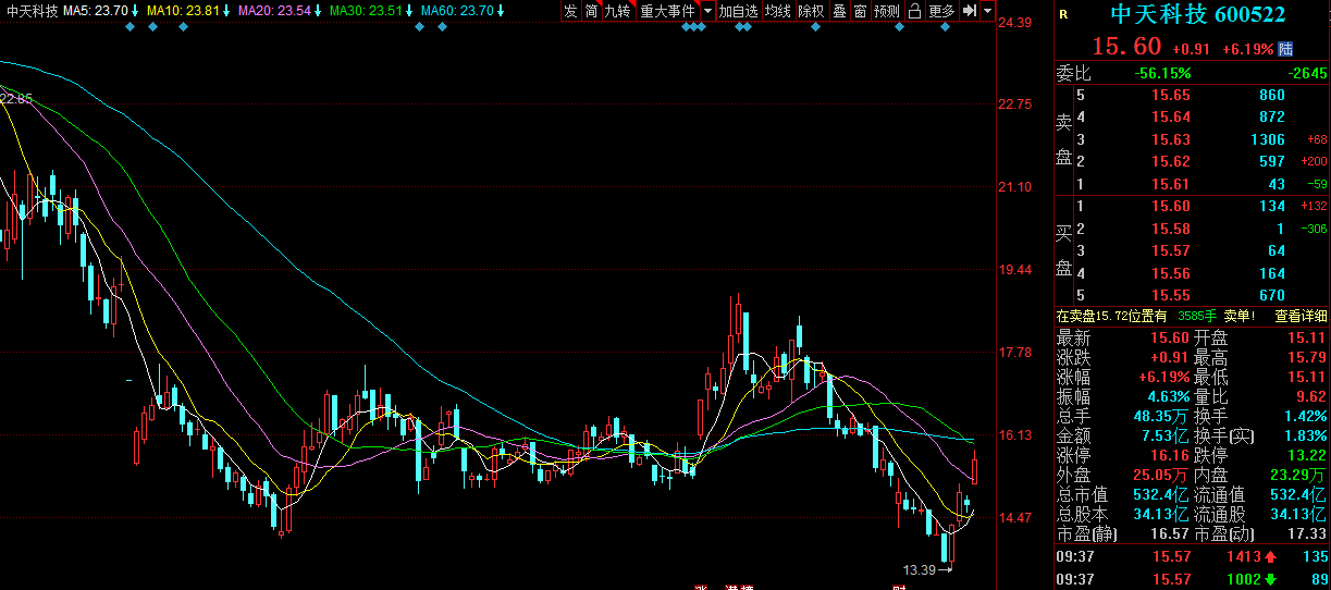 5月15日,中天科技高开,截至发稿,报15.60元,涨6.19%,成交额超7亿元。