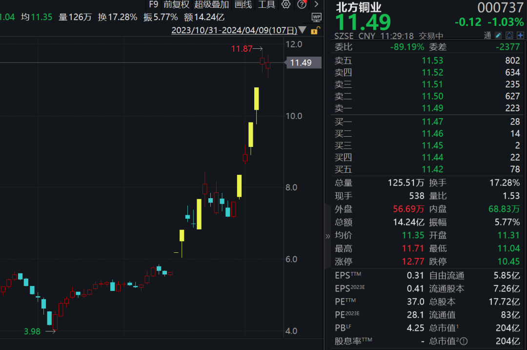 4月8日,北方铜业盘中最高报11.87元/股,较3月8日5.76元/股的收盘价涨幅达108%,一个月内涨幅超过一倍。仅3月28日至4月8日间的六个交易日间,该公司股价就收获超40%涨幅,其中三个交易日出现涨停。