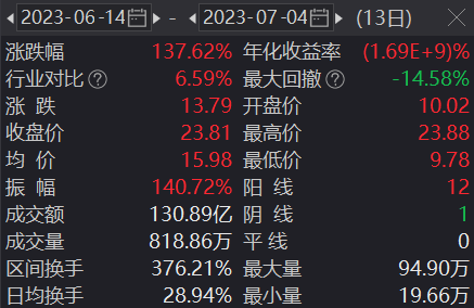 值得注意的是,自6月14日以来,昊志机电股价一路飙升,截至昨日收盘,近三周区间累计涨幅超130%。