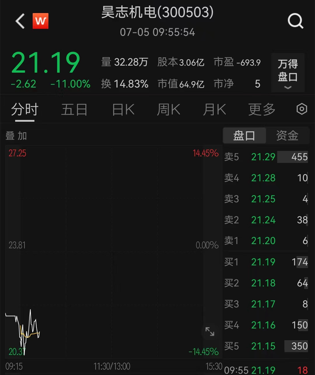 7月5日,昊志机电开盘大跌9.70%,截至发稿,昊志机电跌幅达11%,报21.19元。
