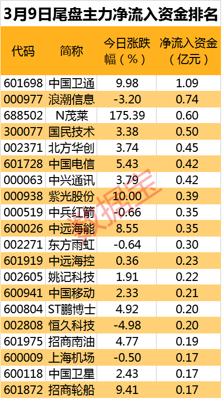 从个股看,有14股尾盘净流入资金超2000万元。中国卫通尾盘获主力抢筹超亿元居首,股价也于尾盘封至涨停,创逾2年新高。